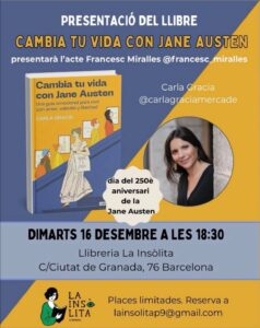 Este martes 16 de diciembre se cumplen 250 años del nacimiento de Jane Austen. Lo celebraremos con una presentación especial en Barcelona, a las 18:30 en La Insólita (c/Ciutat de Granada 76), donde charlaré con Carla Gracia, autora de Cambia tu vida con Jane Austen, y varias escritoras y artistas leerán fragmentos de su obra. Si no te queda muy lejos, te aconsejo no perdértelo.